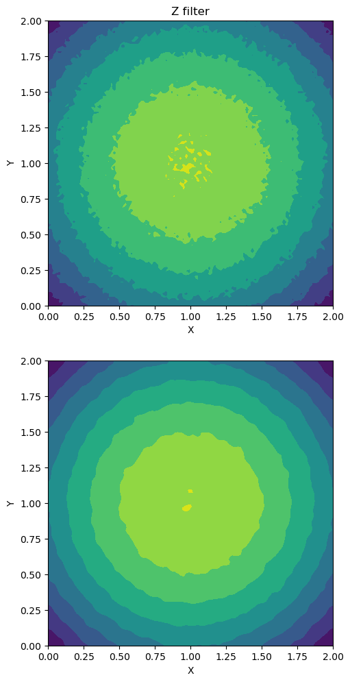 1 2 3 4 5 6 7 8 9 10 11 12 13 14 15 16 17 18 19 20 21 22 23 24 25 26 27 28 29 30 31 32 33 34 35 36 37 38 39 40 41 42 43 44 45 import numpy as npimport matplotlib.pyplot as pltimport matplotlib as mplfrom scipy.stats import multivariate_normalfrom scipy.signal import convolvex = np.linspace(0 , 2.0 , 100 ) y = np.linspace(0 , 2.0 , 100 ) X, Y = np.meshgrid(x, y) Z = np.power(X-1.0 , 2 ) + np.power(Y-1.0 , 2 ) + 0.1 *np.random.normal(scale=0.4 , size=X.shape) def get_v_2d (sigma1, sigma2 ): v_size1 = int (6 *sigma1+1 ) v_size2 = int (6 *sigma2+1 ) mu1 = v_size1//2 mu2 = v_size2//2 v = np.zeros((v_size1, v_size2)) for i in range (v_size1): for j in range (v_size2): v[i, j] = multivariate_normal.pdf([i, j], mean=[mu1, mu2], cov=[[sigma1, 0.0 ], [0.0 , sigma2]]) v = v/np.sum (v) return v def get_gaussian_filter_2d (y, v ): pad_width1 = (int ((v.shape[0 ]-1 )/2.0 ), v.shape[0 ]-1 -int ((v.shape[0 ]-1 )/2.0 )) pad_width2 = (int ((v.shape[1 ]-1 )/2.0 ), v.shape[1 ]-1 -int ((v.shape[1 ]-1 )/2.0 )) y_pad = np.pad(y, (pad_width1, pad_width2), mode='edge' ) y_filter = convolve(y_pad, v, mode='valid' ) return y_filter v = get_v_2d(1.0 , 1.0 ) Z_filter = get_gaussian_filter_2d(Z, v) fig, axs = plt.subplots(ncols=1 , nrows=2 , dpi=100 , layout='constrained' , figsize=[5 ,10 ]) axs[0 ].contourf(X, Y, Z, level=50 , cmap='viridis_r' ) axs[0 ].set_xlabel('X' ) axs[0 ].set_ylabel('Y' ) axs[0 ].set_aspect('equal' ) axs[0 ].set_title('Z' ) axs[1 ].contourf(X, Y, Z_filter, level=50 , cmap='viridis_r' ) axs[1 ].set_xlabel('X' ) axs[1 ].set_ylabel('Y' ) axs[1 ].set_aspect('equal' ) axs[0 ].set_title('Z filter' )